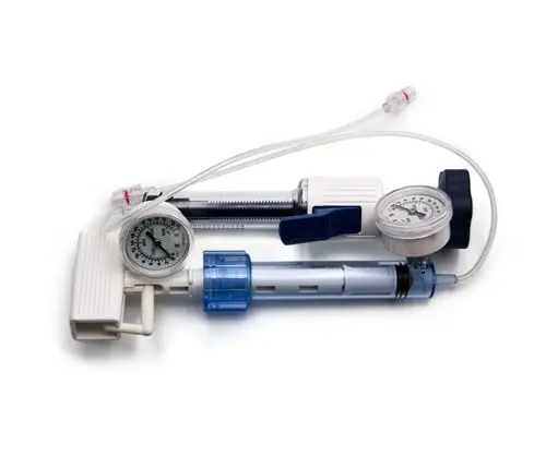Our inflation syringe for inflation and deflation of balloon catheters during angioplasty is available in pressure resistances of 30 bar or 40 bar. Ergonomically shaped syringe body with various handle configurations and pressure gauge.
